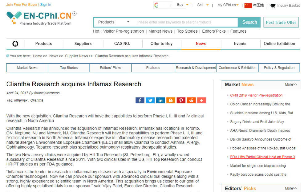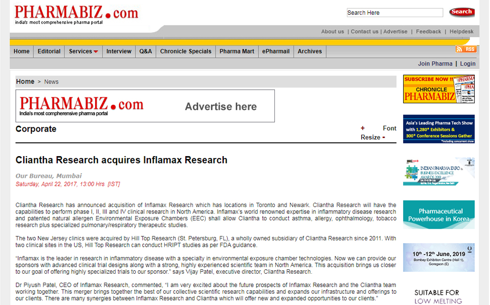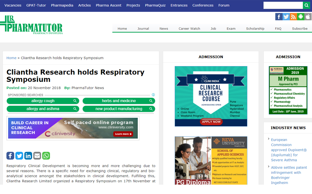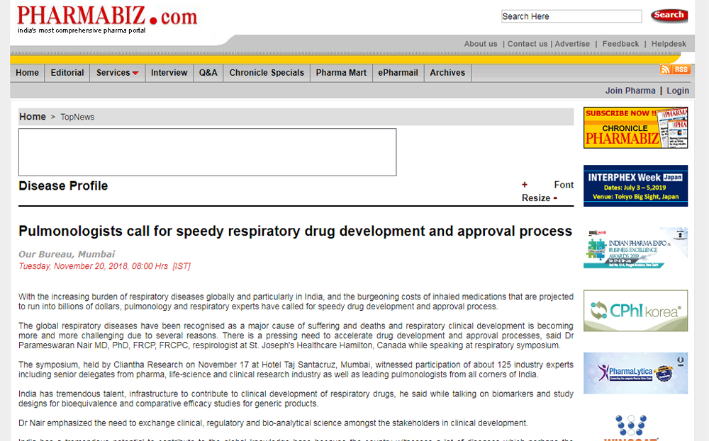 We have worked with our clients to gain time and cost efficiencies by working across the Cliantha globally to conduct such large inhaled trials in both North America and India. This also has advantages of satisfying the regulators requirements to have multiple jurisdictions but also to include North America. India unlike the US, has a high degree of respiratory disease in which patients are treatment naïve and for which recruitment can be facilitated. Inflamax will be talking about this approach at a Cliantha Respiratory Symposium in Mumbai, 17th Nov, 2018 entitled, “Respiratory Research: Insights into the Clinical Development of Respiratory Drugs”. Please contact Ms. Geetu on gbulchandani@cliantha.com for more information on these topics or on the Cliantha Respiratory Symposium.