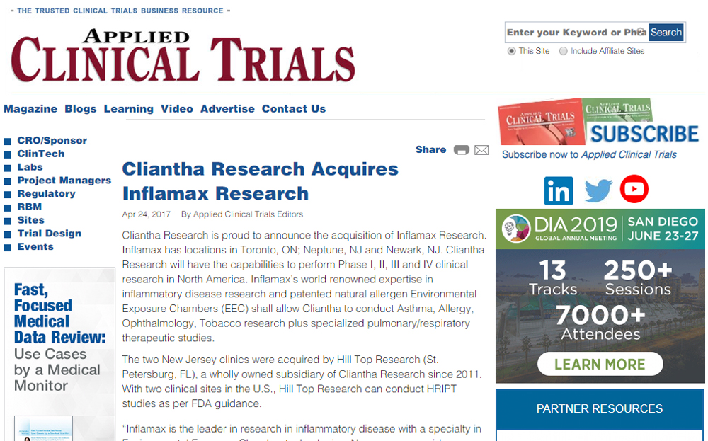 Inflamax has been awarded a FIH study to study a novel allergen immunotherapy. This combines Inflamax’s unique expertise in allergy as well as to conduct Phase 1 FIH studies. Inflamax Research has conducted many studies in ragweed allergy and has been successful in meeting recruitment targets in Phase I-IV ragweed allergy studies. This study will have primary endpoint of safety and will include some efficacy assessment towards insight into effectiveness of treatment and mechanism of action. This study, a FIH Study, will be for our European client to study an innovative product to help with ragweed allergy. Inflamax’s extensive database, social media recruiting expertise and experience working with the allergy community will make this possible. In this way, Inflamax can also work with our Sponsors in key therapeutic areas to provide full development from Phase I through to Phase III study services.