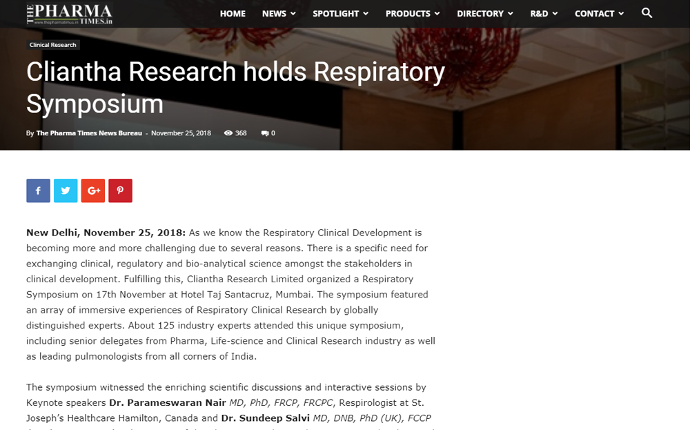 As we know the Respiratory Clinical Development is becoming more and more challenging due to several reasons. There is a specific need for exchanging clinical, regulatory and bio-analytical science amongst the stakeholders in clinical development. Fulfilling this, Cliantha Research Limited organized a Respiratory Symposium on 17th November at Hotel Taj Santacruz, Mumbai. The symposium featured an array of immersive experiences of Respiratory Clinical Research by globally distinguished experts. About 125 industry experts attended this unique symposium, including senior delegates from Pharma, Life-science and Clinical Research industry as well as leading pulmonologists from all corners of India.