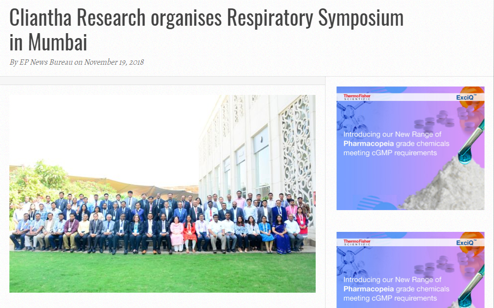 The symposium witnessed the enriching scientific discussions and interactive sessions by Keynote speakers Dr. Parameswaran Nair MD, PhD, FRCP, FRCPC, Respirologist at St. Joseph's Healthcare Hamilton, Canada and Dr. Sundeep Salvi MD, DNB, PhD (UK), FCCP (USA), Hon. FRCP (Lon), Director of the Chest Research Foundation, Pune, India along with other experts Dr. Piyush Patel MD, FRCPC, Principal Scientist, Inflamax Research (Cliantha Group), North America; Dr. Anne Marie Salapatek MSc, PhD, Executive VP & Chief Science Officer, Inflamax Research (Cliantha Group), North America and Dr. Chinna Pamidi Ph.D, President/Head of Operations, Hill Top Research (Cliantha Group), North America.