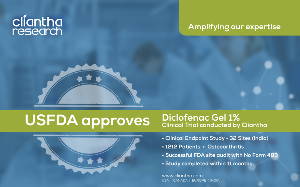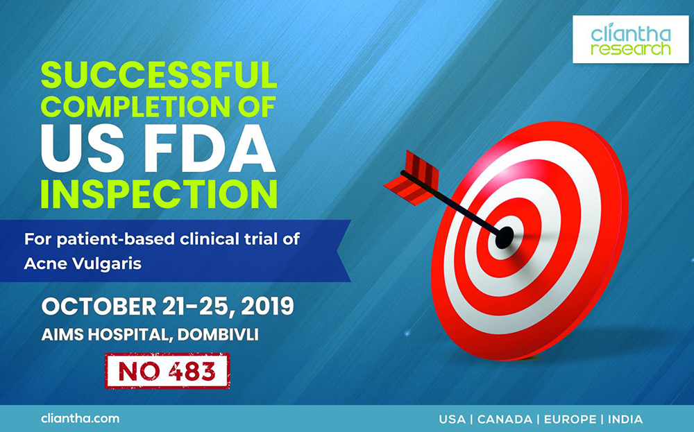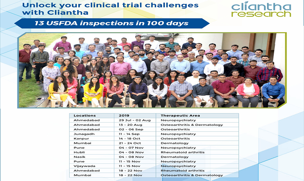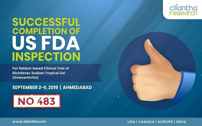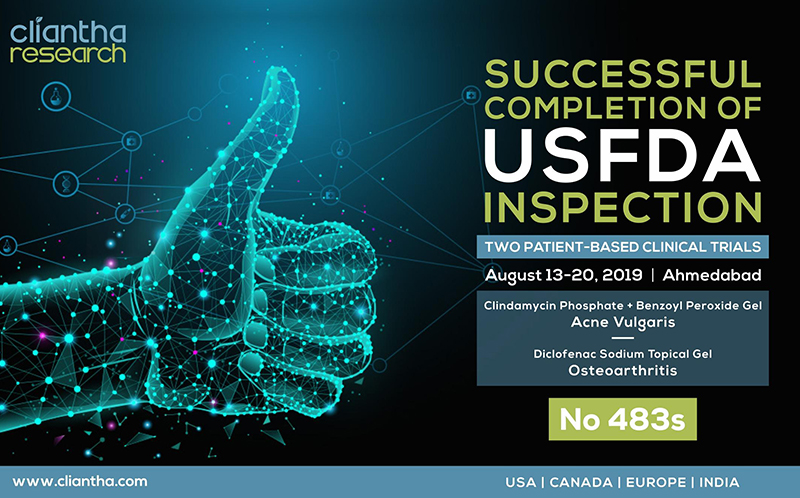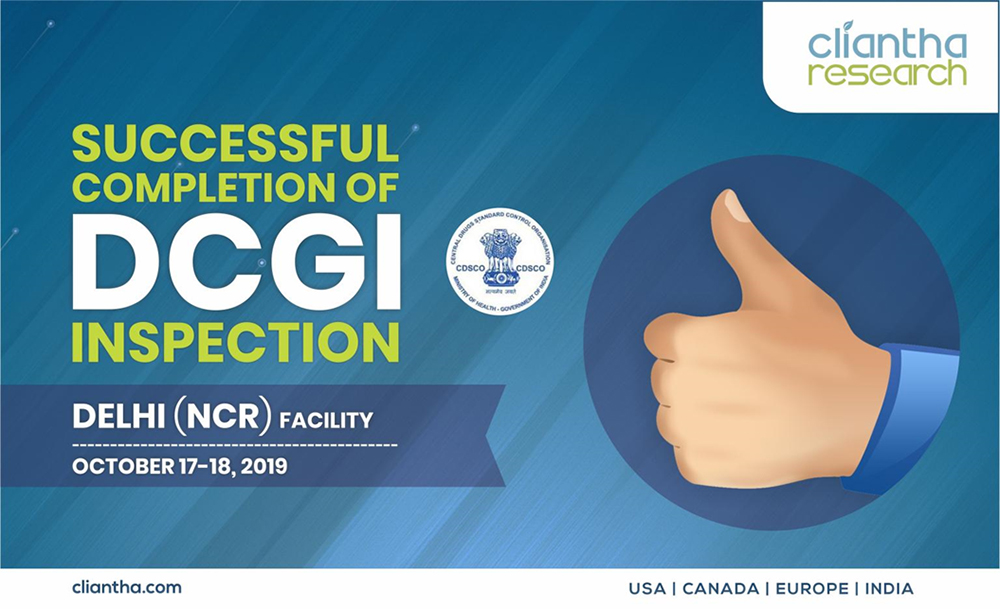 Cliantha has successfully completed its 18th multi-centric site inspection. It was an unannounced inspection & successful completion immaculate our regulatory and quality track record in clinical trials. The inspection was conducted in Osteoarthritis indication at Himmatnagar site between 17th - 20th Sep, 2018 & was concluded without any observation. Clearance of such unannounced inspections depicts our strict adherence to quality parameters.