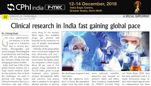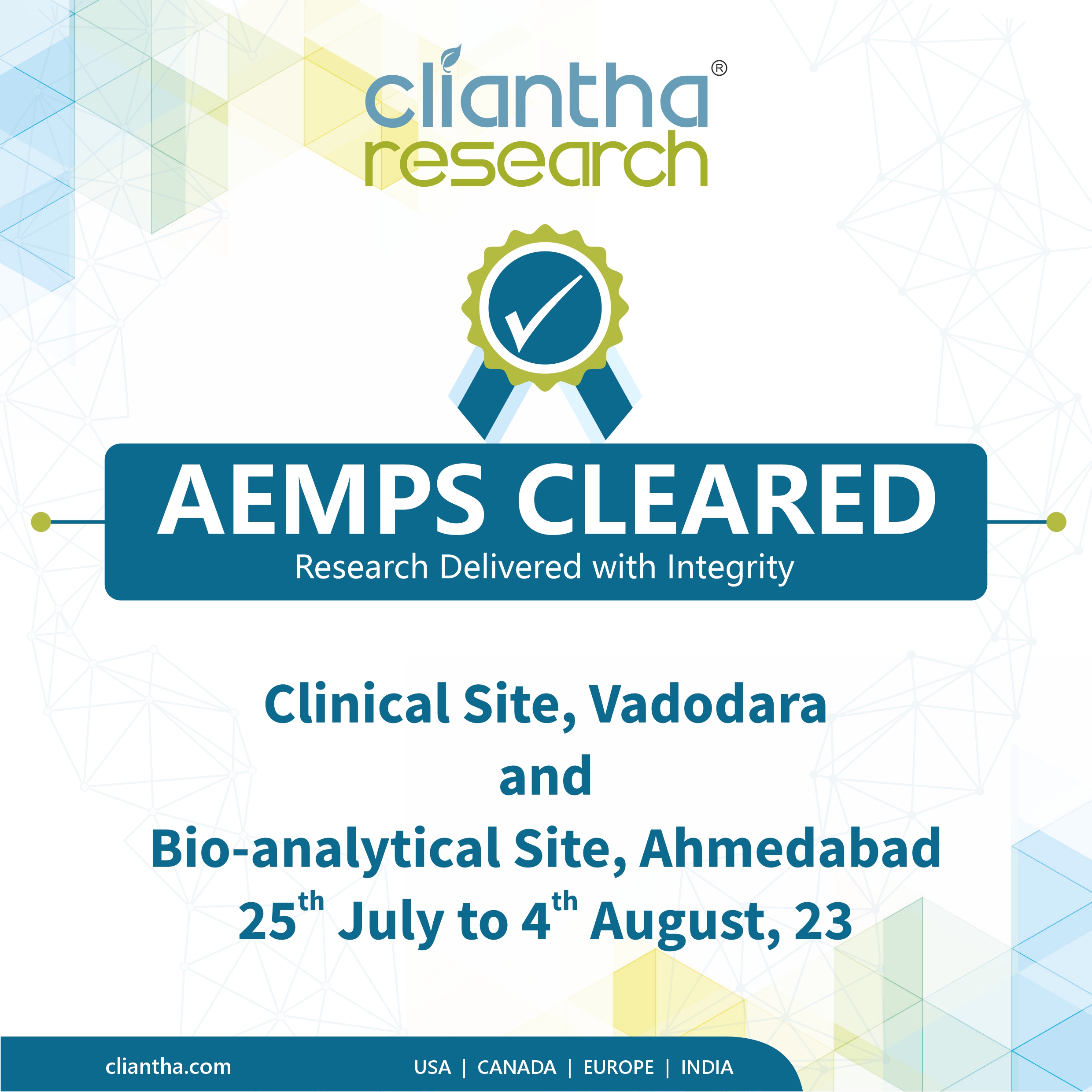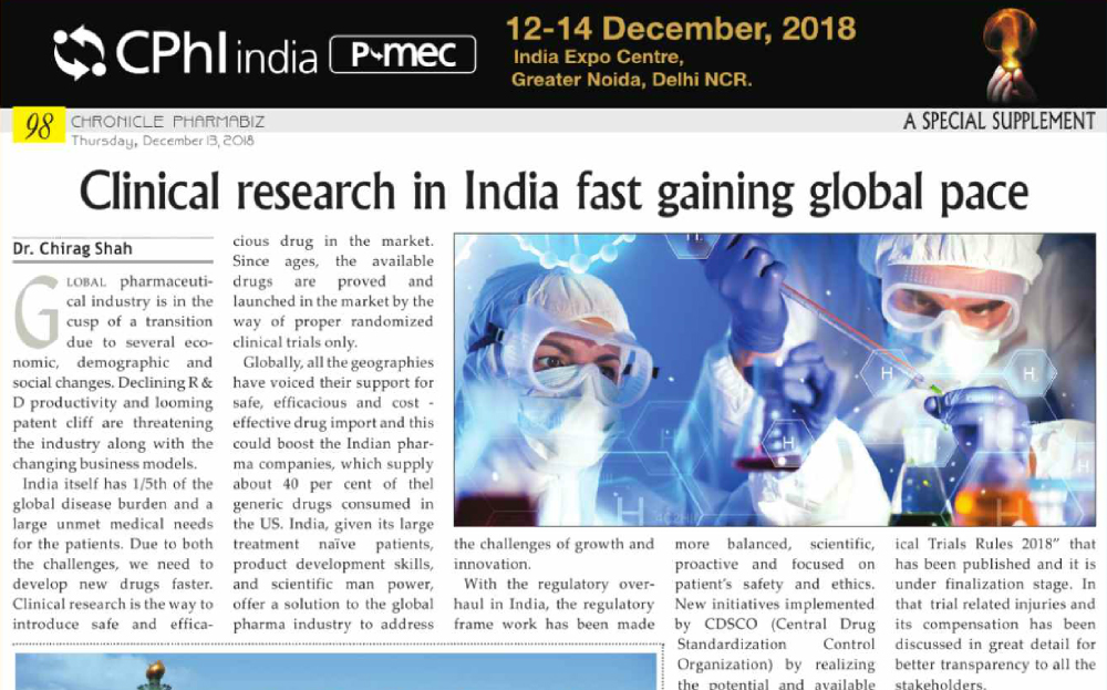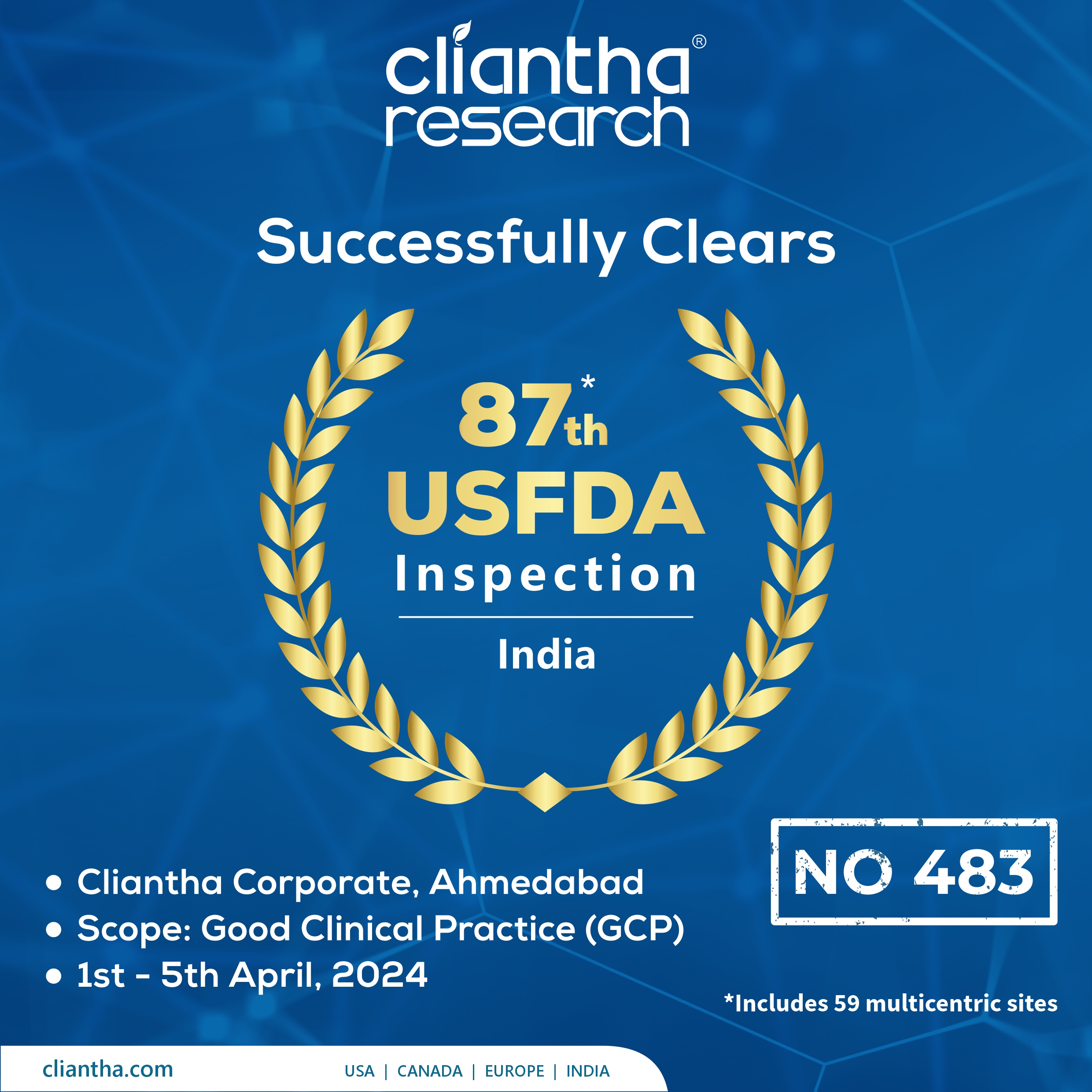 Cliantha has successfully completed its 18th multi-centric site inspection. It was an unannounced inspection & successful completion immaculate our regulatory and quality track record in clinical trials. The inspection was conducted in Osteoarthritis indication at Himmatnagar site between 17th - 20th Sep, 2018 & was concluded without any observation. Clearance of such unannounced inspections depicts our strict adherence to quality parameters.