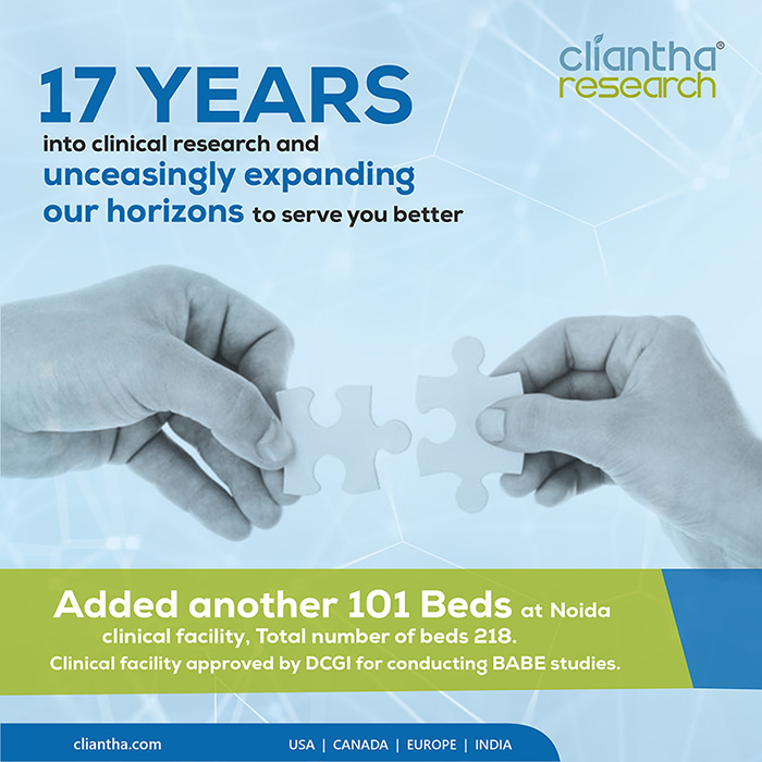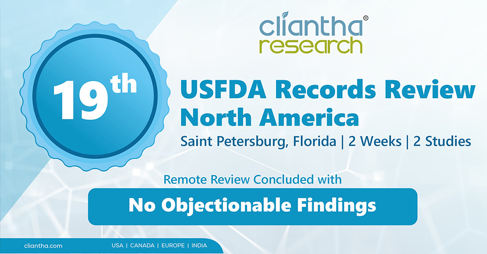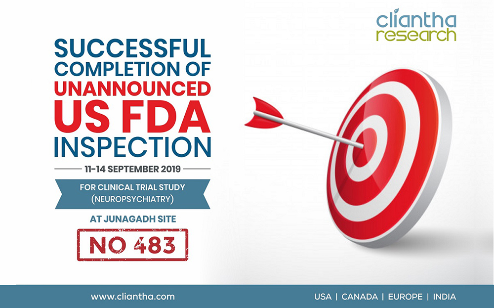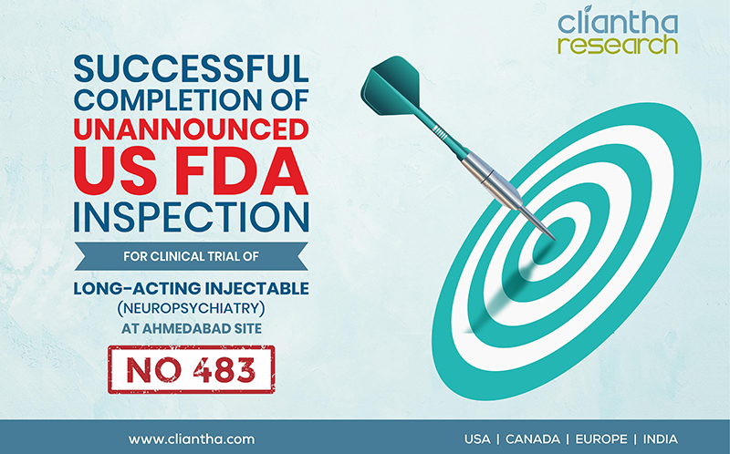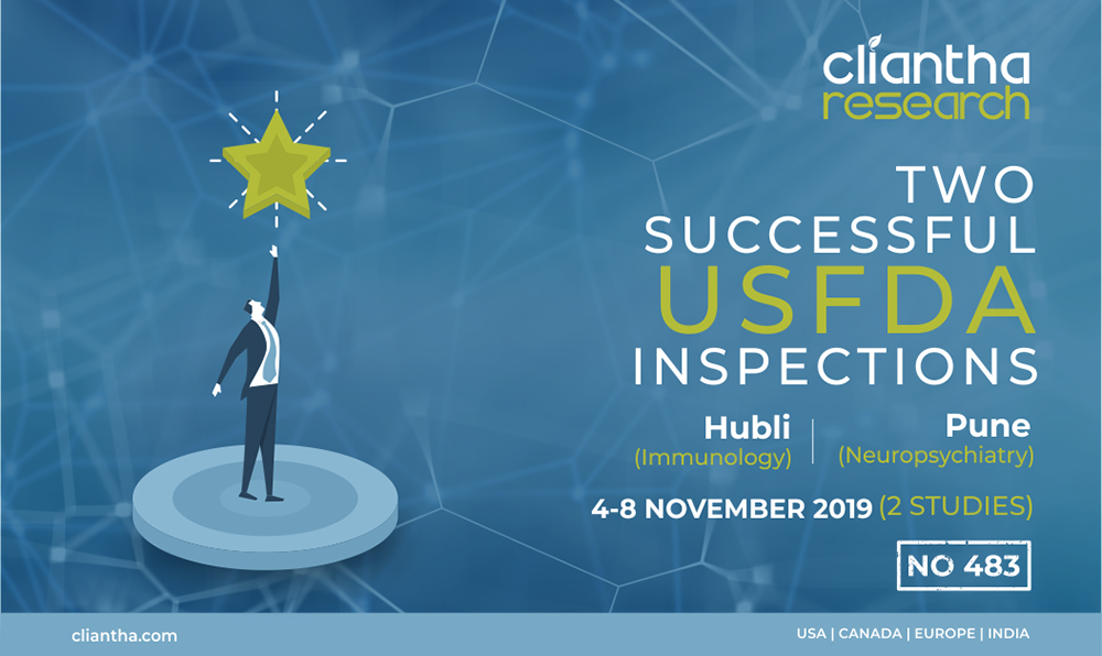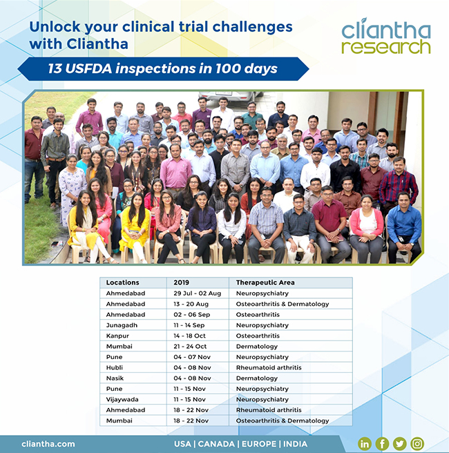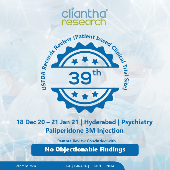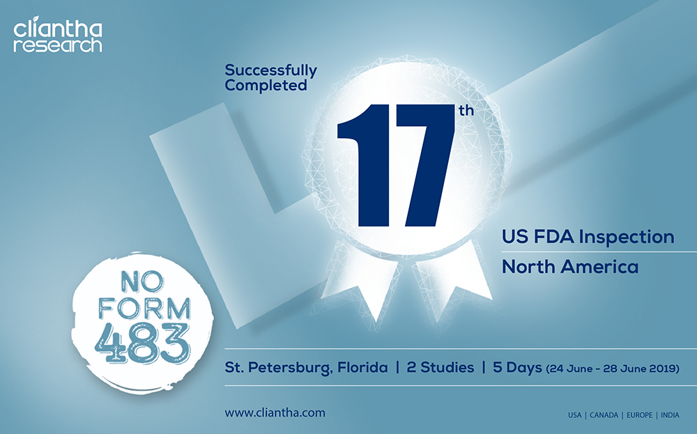 Where every experience counts, Cliantha Research has once again successfully completed its 16th & 17th clinical trial study inspection which portrays our impeccable regulatory and quality track record in clinical trials. The inspection was conducted at Pune (30th May - 1st Jun, 2018) & Gandhinagar site (28th May - 5th Jun, 2018) on Patient based clinical study in Psychiatry indication & both the inspections were concluded without observation. Clearance of such unannounced inspections depicts our adherence to quality parameters.