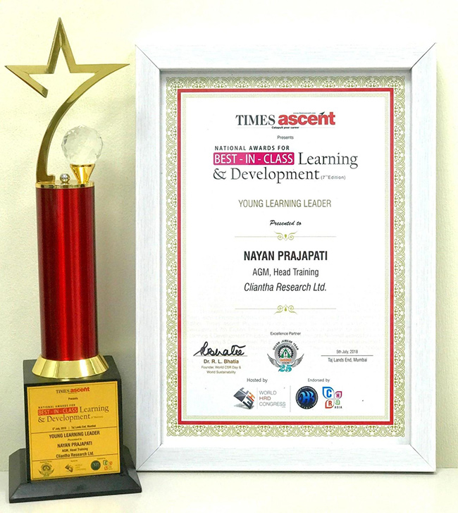 This extra mile which we walk very often fetched us an award. Our lead trainer Nayan Prajapati won "Times Ascent - Young Learning Leader Award" at National Awards for Best In Class Learning & Development (7th Edition), Mumbai on 5th Jul, 2018.